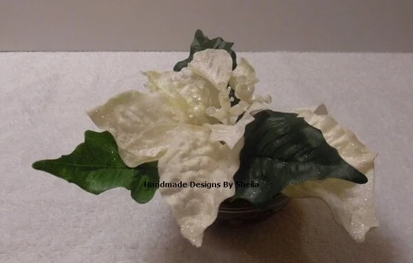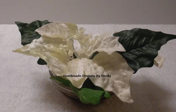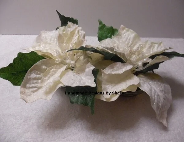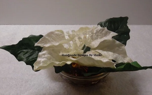 Gold-trimmed velvet poinsettia arrangement, small amber-colored glass gems in a clear, hardened resin sit in a small, clear, glass bowl. Cream-colored velvet leaves trimmed in gold glitter with gold-glittered jewels for the "cyathia", or the flowers. Dark evergreen leaves surround the outer bracts.